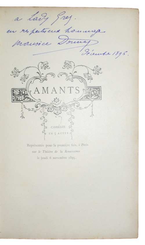 [6], 258pp, [2]. Near contemporary green half-morocco, marbled boards, lettered in gilt, T.E.G., with original publisher's printed paper wrappers bound in. A trifle rubbed, spine sunned. Marbled endpapers, bookplate of Gladys de Grey to FEP, lightly foxed. Presentation copy, inscribed to half-title; 'a Lady Grey / un respectueux hommage / Maurice Donnay / Decembre 1896'.