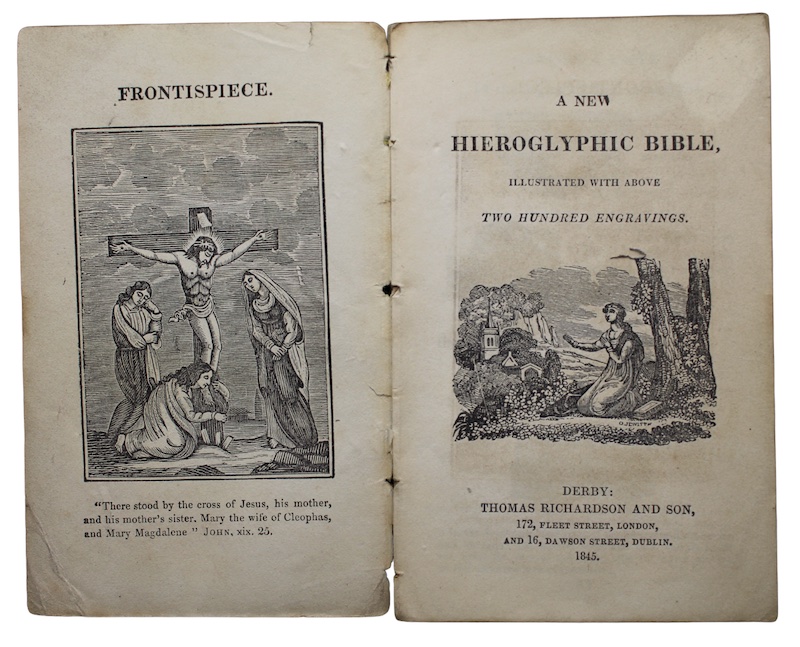 A mid-nineteenth-century edition, in original unsophisticated state, of Derby-based printer and publisher Thomas Richardson's emblematical bible designed to familiarise young readers with the holy scripture. This unorthodox production replaces key words and phrases with well-executed engravings with the aim of simplifying reading of the (much abridged) gospels; though deciphering the intention of the symbols does on occasion present its own challenge - thankfully complete sentences with the original terms reinstated are provided at the foot of each page.