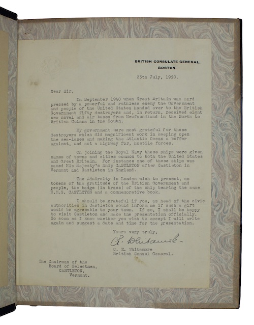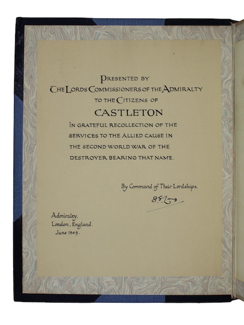 107pp, [1]. With fifty mounted photographs. Bound for presentation in contemporary navy half-morocco, blue cloth boards, gilt lettering and nautical motifs to spine, T.E.G. Lightly rubbed and marked. Marbled endpapers, internally clean and crisp. Presentation plate to FEP: 'Presented by the Lords Commissioners of the Admiralty to the citizens of Castleton in grateful recollection of the services to the allied cause in the Second World War of the destroyer bearing that name'. T.L.S. dated 25th July, 1950 pasted to recto of FFEP; addressed by British Consul General C. E. Whitamore to an unnamed Castleton civic servant, offering to confer the book (and a brass badge of the H.M.S. Castleton) at an official presentation. Blind-stamp to front blank fly-leaf of educator, amateur historian, and sometime resident of Castleton (where he graduated Teachers College in 1957), Douglas Ronald Monmaney (1934-2006).