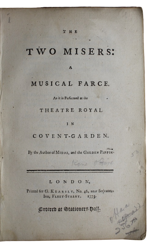 The first edition of Irish playwright Kane O'Hara's (1711/12-1782) musical adaptation of M. de Falbaire's Les deux avares.