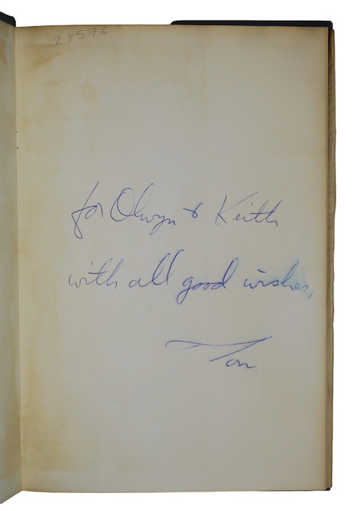 72pp. Original publisher's turquoise cloth lettered in gilt, with the original photographic dustwrapper. Wrapper with significant losses to the front panel, with staining and some smoke damage. Boards a little stained and faded, associated smoke odour. Lightly toned with minor water damage, some pages adhered. Inscribed 'to Olwyn & Keith with all good wishes Tom' on the FFEP, a little water smudged. From the estate of Olwyn Hughes, recently dispersed; the smoke damage is the result of an errant cigarette dropped by Olwyn down the back of her sofa, which caused a serious fire.