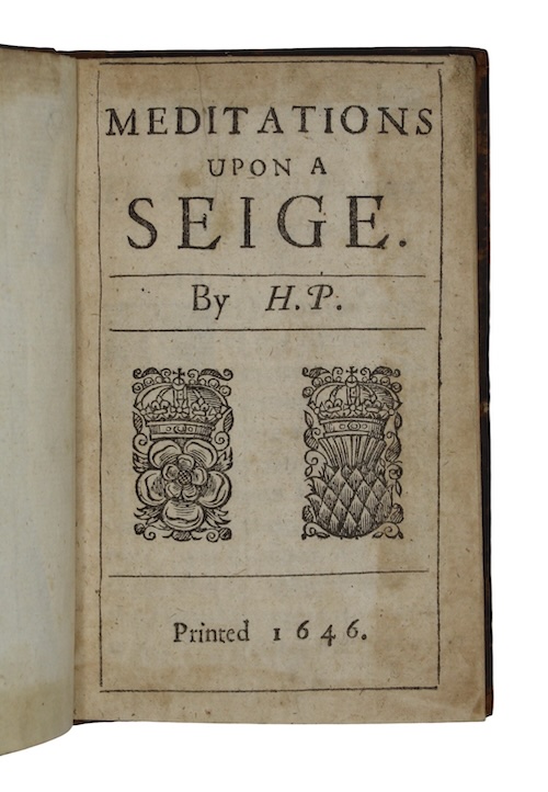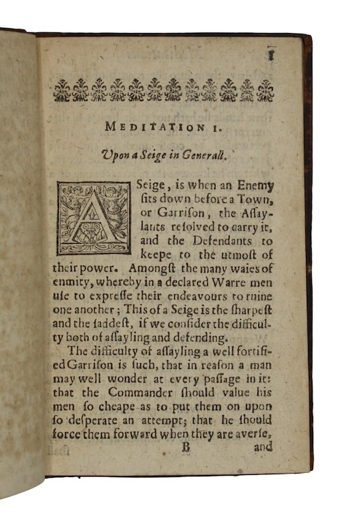 A rare, evocative and entirely nuanced collection of 44 meditations on the military, social, economic and psychological impacts of siege warfare, printed in Oxford likely just after the lifting of the third siege there in 5 years.
