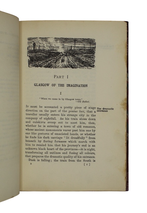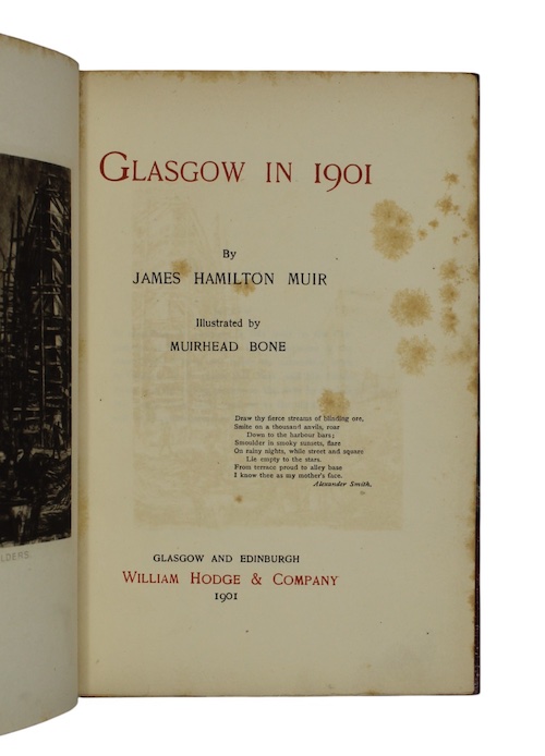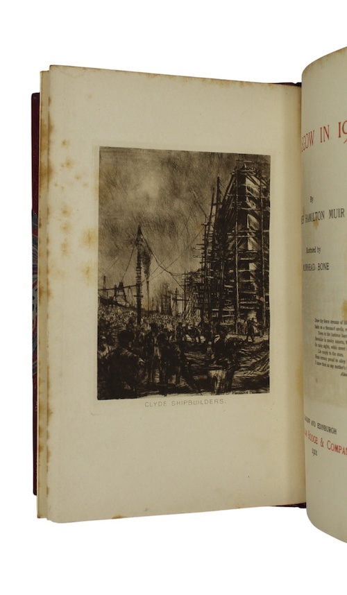 An attractively bound copy of the first edition of an account of Glasgow's culture and industry, with a particular focus on the working people's democracy and camaraderie. The author, 'James Hamilton Muir ' is actually a pseudonym denoting a collective of three Glaswegian creatives - the artist Muirhead Bone (1876-1953), the international lawyer Archibald Charteris (1874-1940), and the journalist James Bone (1872-1962). The work, clearly written with immense local pride, sees each author lending his own expertise - the multitudinous engravings, of Muirhead Bone's hand, are complimented by James Bone's experience in the shipbuilding industry, and his pride in Glasgow's steam navigation.