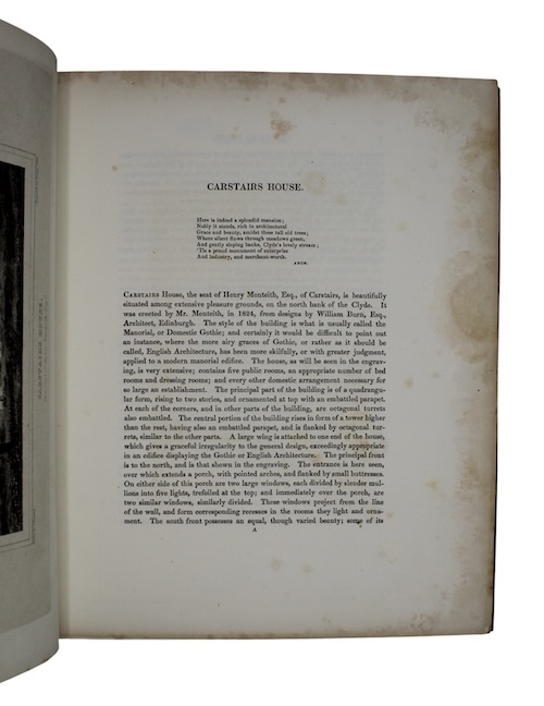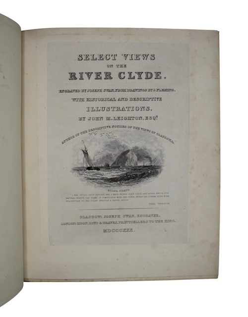 The first edition, finely bound, of the second collaboration between Scottish travel writer and topographer John M. Leighton and noted Glaswegian engraver Joseph Swan (1796- 1872), richly furnished with the drawings of local painter John Fleming (1792-1845). Having published their first work two years prior, the successful Select Views of Glasgow and its Environs (1828), the three would continue their promising partnership, producing their best-known collaboration, Select Views of the Lakes of Scotland, in 1834.