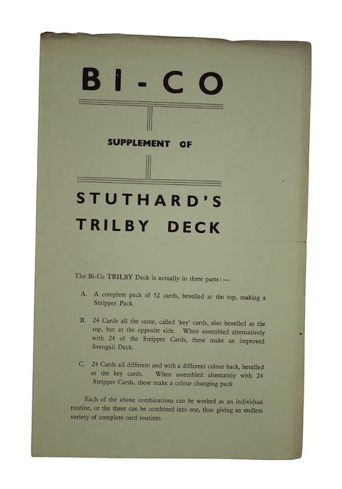 The first edition of a pamphlet detailing and explaining a complete card act designed by Edgar Joseph 'Joe' Stuthard (1911-1992), magician, entertainer, and magic inventor, famed for his talents with a Svengali deck. The manual, structured carefully to introduce the amateur sleight-of-hand student to Stuthard's specially engineered 'Trilby' deck, was clearly successful, being revised the following year and reprinted in a further edition in 1953.