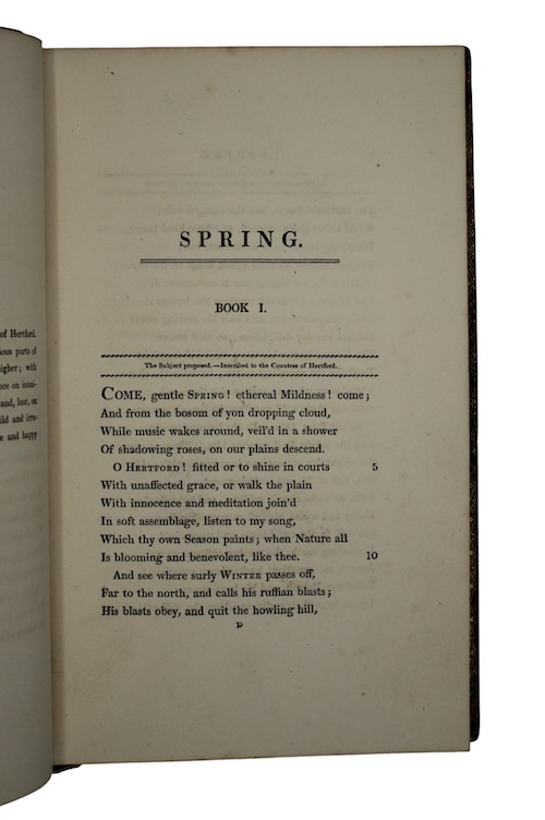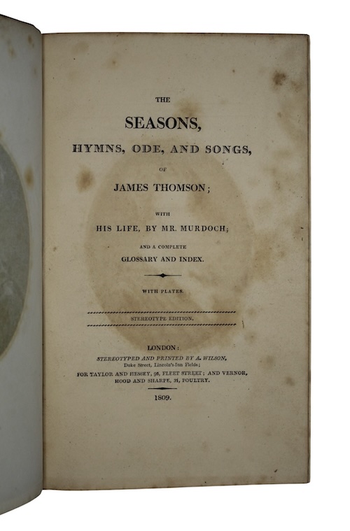An early nineteenth-century stereotype edition of Scottish poet and playwright James Thomson's (1700-1748) collected poetical works. The Seasons were first printed separately, beginning with 'Winter' in 1726, with the complete cycle of four first published collectively in 1730.